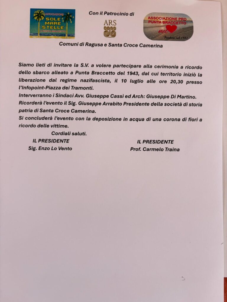 sono iniziate le attività culturali inserite nel programma delle manifestazioni estive promosse dalla nostra Associazione. Pertanto, Vi comunico che giorno 10 luglio p.v., alle ore 20,30 circa, presso l’infopoint di Piazza dei Tramonti di Punta Braccetto, si terrà la conferenza storica dal titolo “Lo sbarco alleato del 10 luglio 1943 a Punta Braccetto”, a cura dello Scrivente. L’evento richiama l’anniversario dello sbarco in Sicilia da cui ebbe inizio la liberazione del regime nazi-fascista. Considerata la particolare ricorrenza e le argomentazioni che saranno trattate, come di consueto, Vi chiedo di estendere l’invito ad amici, simpatizzanti ed estimatori. Sarà mia cura rammentarvi dell’evento nei giorni che lo precederanno. In allegato inoltro la locandina dell’evento.